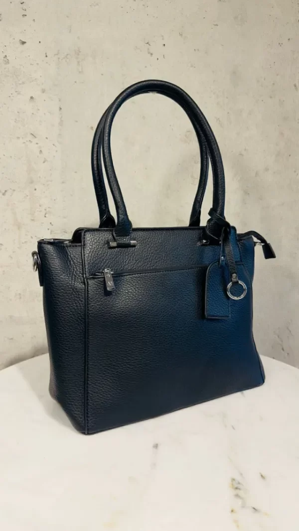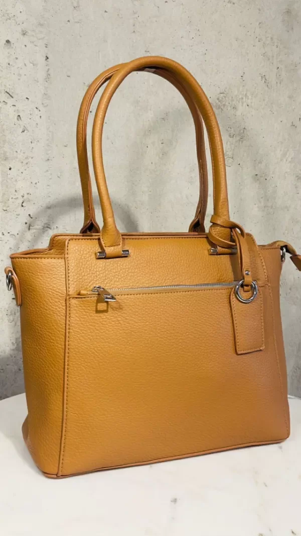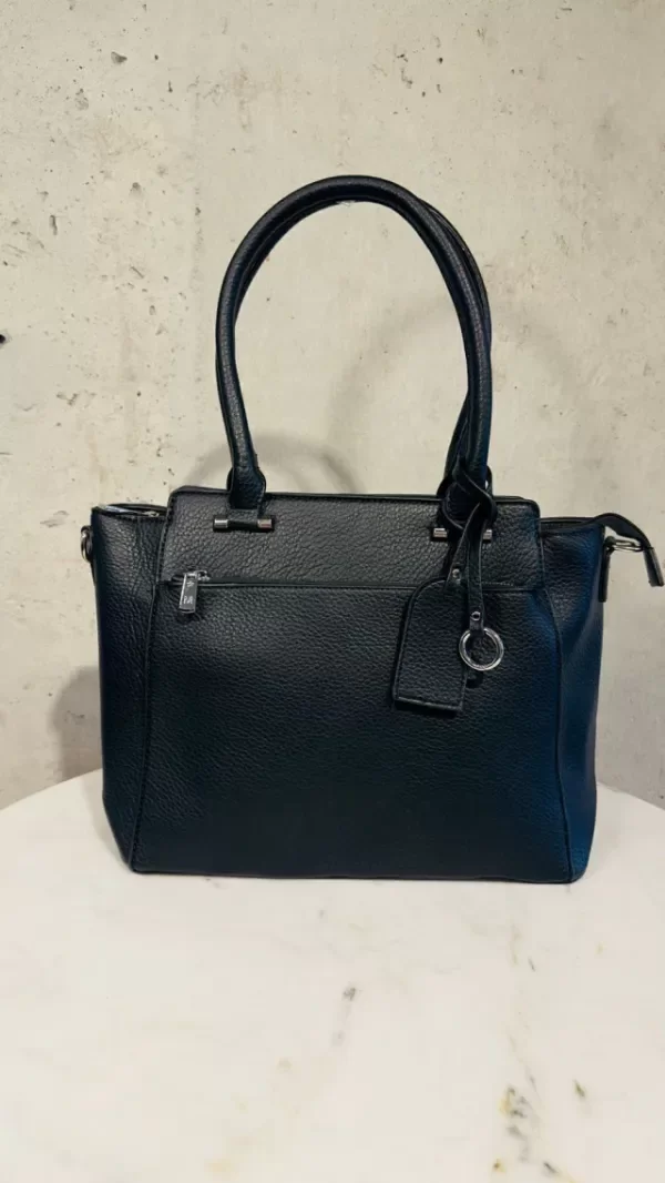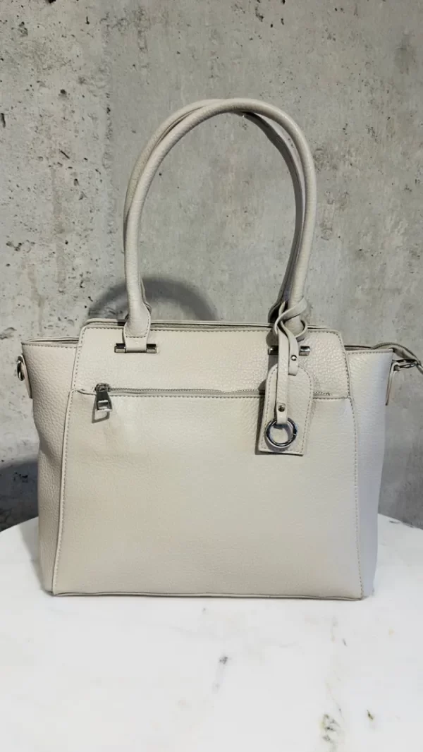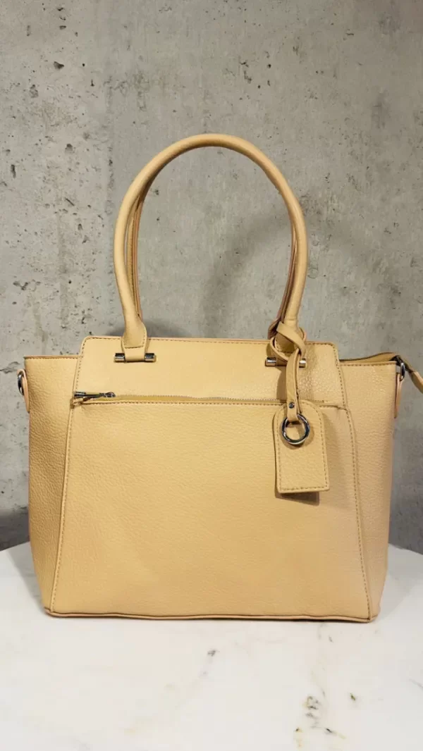 Cartera elegante y funcional, confeccionada en material simil cuero con textura graneada que aporta resistencia y un acabado sofisticado. Presenta un diseño estructurado con líneas limpias y asas firmes para un agarre cómodo. En el frente incorpora un práctico bolsillo con cierre, ideal para llevar a mano lo esencial. En la parte superior, su cierre principal asegura muy buena capacidad interna para organizar todo tu día.