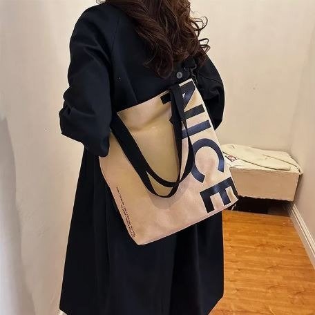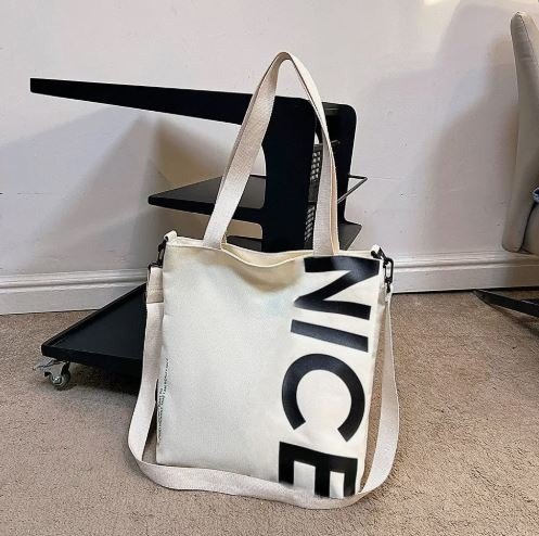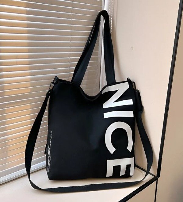 Estos tote bags modelo NICE combinan practicidad, estilo urbano y comodidad para el uso diario. Fabricados en tela resistente, cuentan con un diseño minimalista y moderno con la palabra NICE en gran tamaño, lo que los convierte en un accesorio ideal para quienes buscan un bolso funcional sin perder estilo.