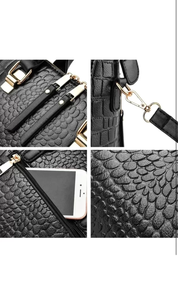 - Estilo: Su diseño estructurado la convierte en una opción ideal para el uso diario o para eventos formales, combinando elegancia y funcionalidad. Tiene asas cortas para llevarla en la mano y una correa larga ajustable y desmontable, ideal para usarla como bandolera.