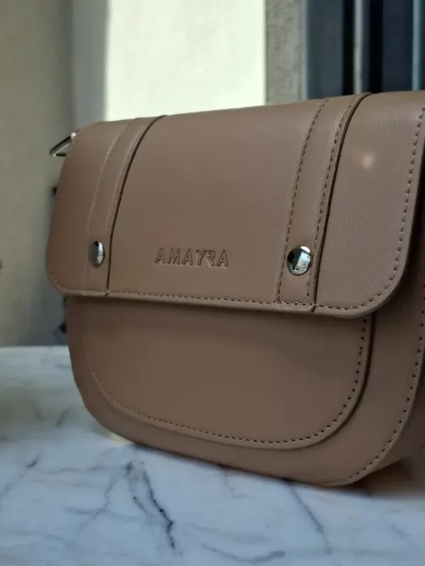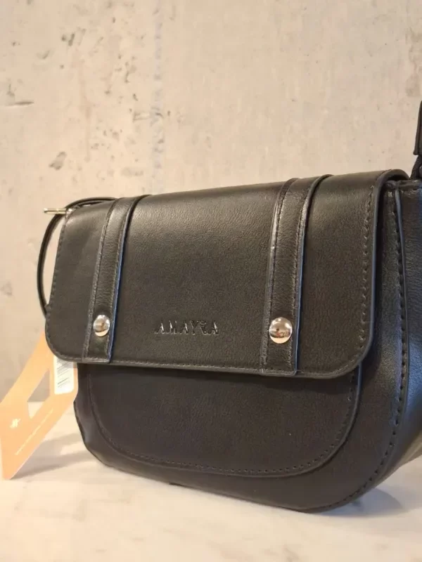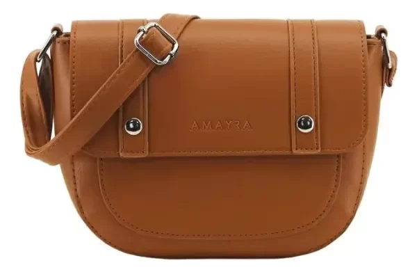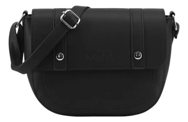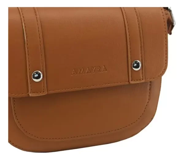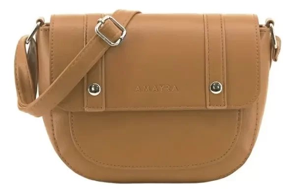 Cartera estilo saddle de la marca Amayra, diseñada con líneas suaves y una silueta estructurada que aporta un toque de elegancia casual. Presenta una solapa frontal con detalle decorativo de tachas. Su correa ajustable permite adaptarla cómodamente al estilo de uso preferido, ya sea al hombro o cruzada. Con unas medidas de 22 cm de ancho, 17 cm de alto y 8 cm de profundidad, esta pieza combina funcionalidad y diseño en un formato compacto y versátil, ideal para el día a día.