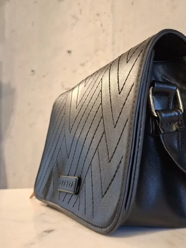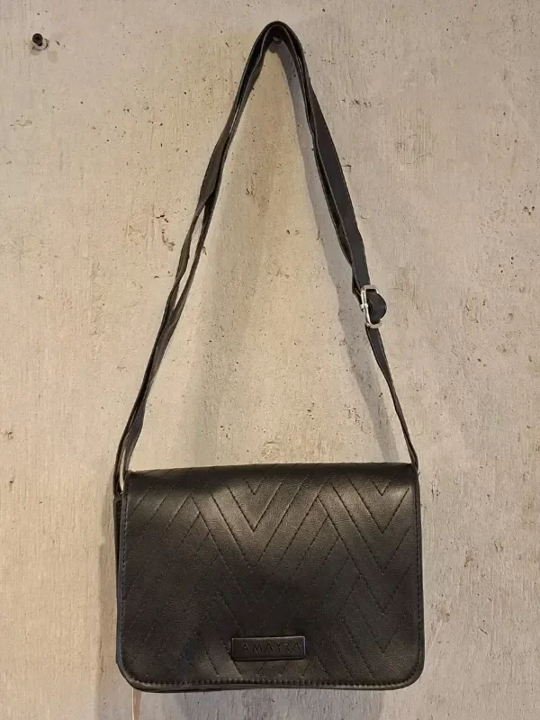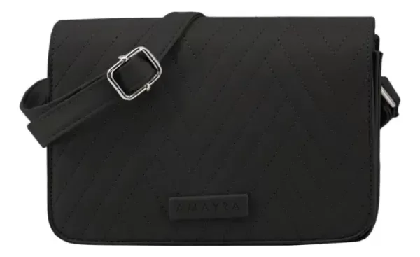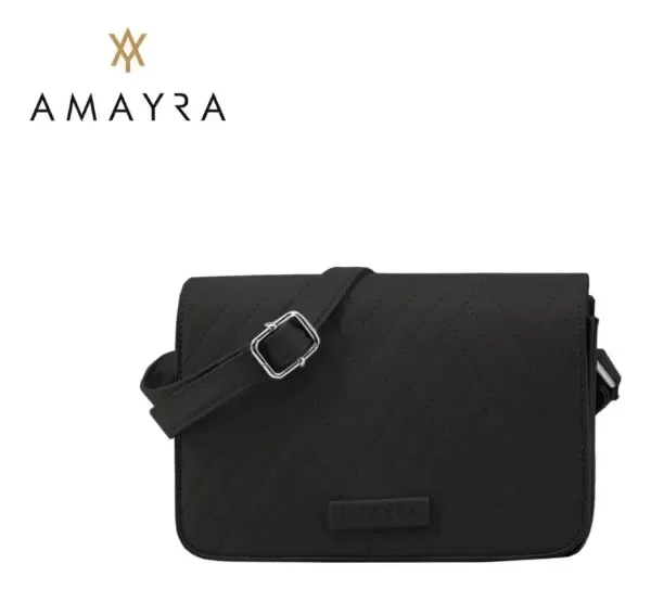 Mini bag Amayra con solapa, confeccionada en símil cuero de textura suave y costuras decorativas en forma de “V” que crean un diseño moderno y elegante. Cuenta con correa bandolera regulable para un uso cómodo y versátil. Cierre imantado bajo la solapa y detalle frontal con logo metálico de la marca. Su tamaño compacto la convierte en el accesorio ideal para llevar lo esencial con estilo en cualquier ocasión.