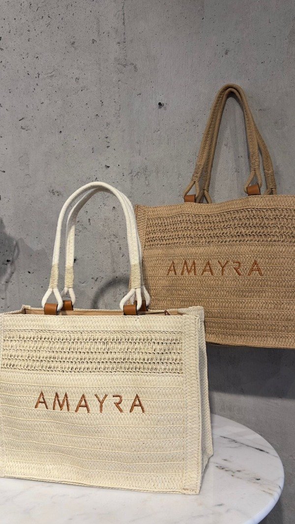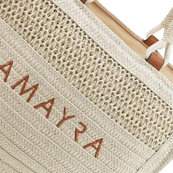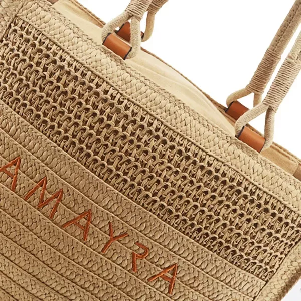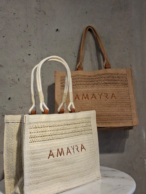 Bolso Amayra de formato rectangular con diseño tejido y detalles calados en la parte superior, que aportan frescura y estilo. Presenta asas largas y resistentes para llevar cómodamente al hombro o en mano, junto con el logo bordado en relieve en el frente, destacando la identidad de la marca. Su interior amplio y funcional lo convierte en un accesorio ideal para acompañar el día a día con un aire natural y moderno.